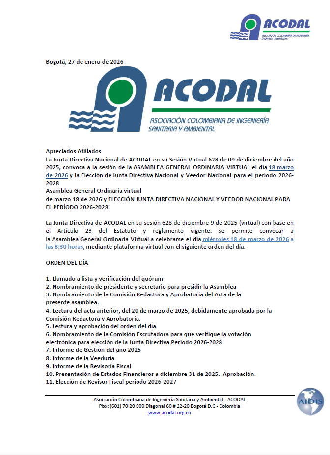 CITACIÓN ASAMBLEA GENERAL ORDINARIA | VIRTUAL | MARZO 18 DE 2026La Junta Directiva Nacional de ACODAL en su Sesión Virtual 628 de 09 de diciembre del año 2025, convoca a…BlogComunicados GremialesPublicado: 28 enero, 202619 visitas